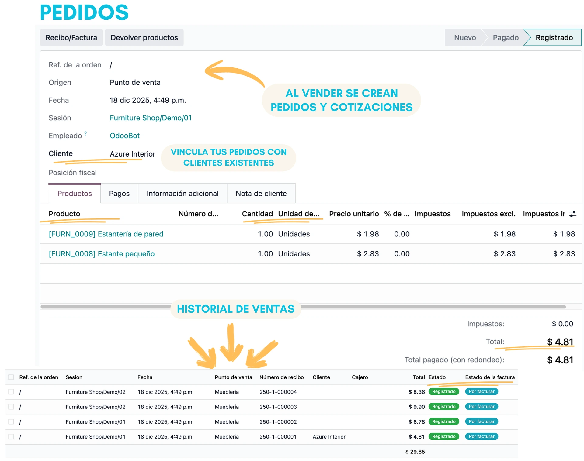 Crea cotizaciones y pedidos fácilmente para tus clientes, manteniendo un registro completo de cada operación comercial. El sistema registra pedidos de clientes, el historial de ventas y brinda control de precios y descuentos.