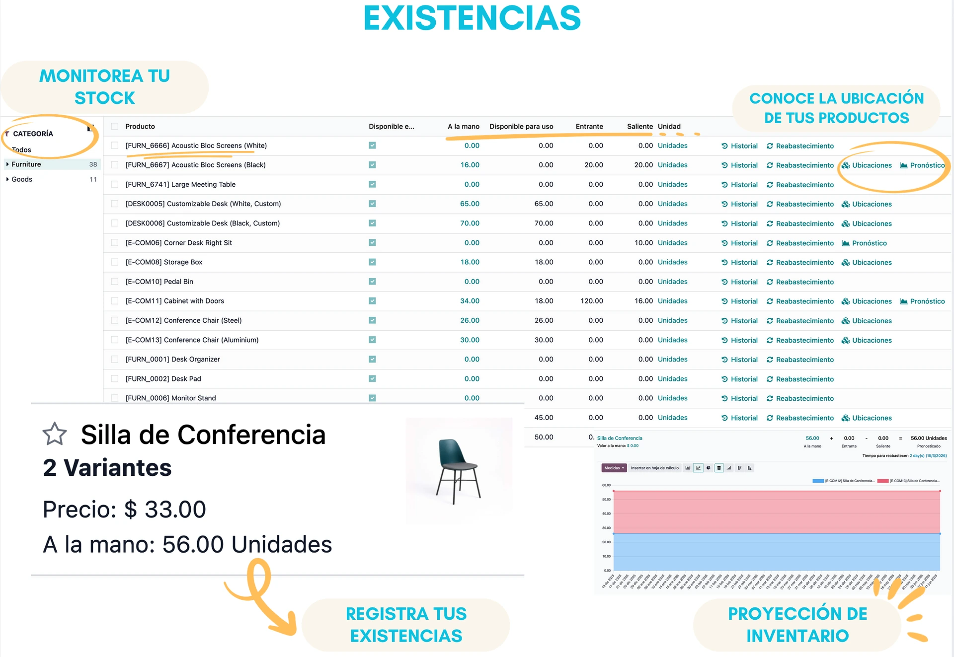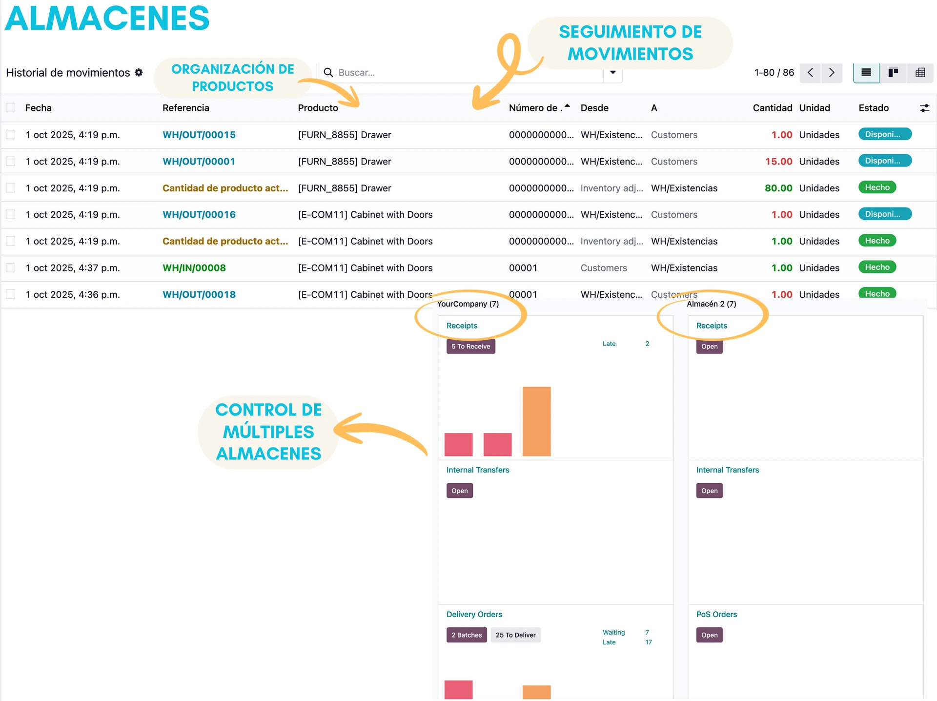 Administra uno o varios almacenes y controla los movimientos de entrada, salida y transferencia de productos.